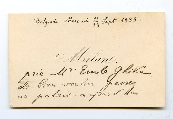 2 SS. Carte de Visite-Format. Milan prie Mr. Emile Glika de bien vouloir passez au palais aujourd'hui dans la matineé. - Die Datierung gemäß einer kl. zeitgenöss. Notiz von fremder Hand am oberen Rand der Recto-Seite.