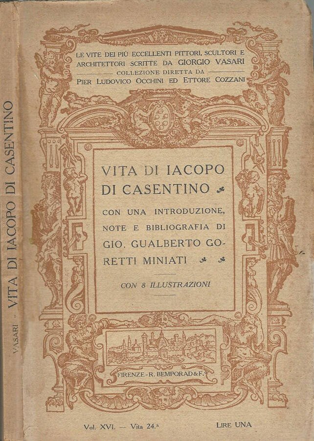 Volume numero "XVI" della collana diretta da Ludovico Occhini e Ettore Cozzani "Le vite più eccellenti pittori, scultori e architettori scritte da Giorgio Vasari"; introduzione, note e bibliografia di Gio. Gualberto Coretti Miniati. La copertina illustrata e brunita dal tempo, presenta segni di usura ai margini con piccoli strappi e mancanze agli stessi e sporadiche, leggere, macchioline di fioritura ai piatti. Da segnalare parziale dissaldatura del piatto anteriore della coperta alla cerniera. Pagine brunite e sporadicamente fiorite in particolare a ridosso dei bordi a barbe lievemente cotti e logorati dal tempo. Opera con 8 illustrazioni in bianco e nero fuori testo. Numero pagine 83.