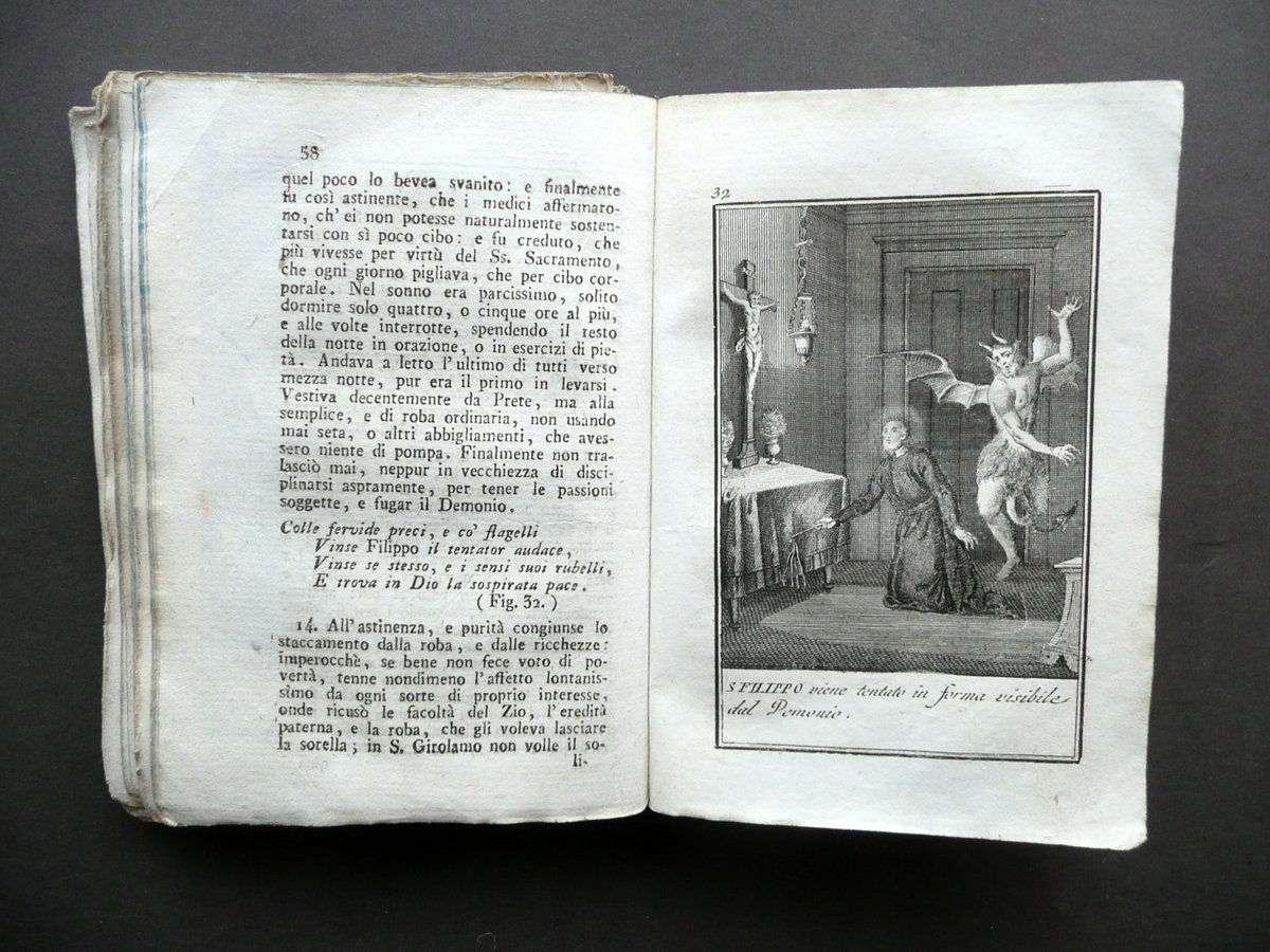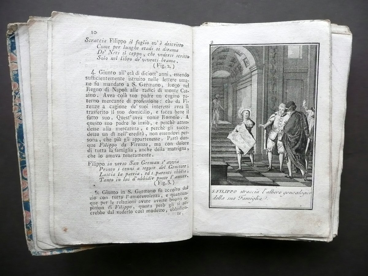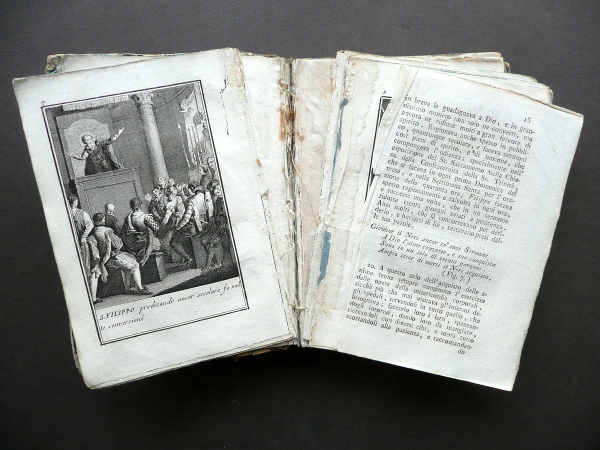 Pietro Giacomo Bacci, † Vita in compendio di San Filippo Neri Fondatore della Congregazione dell'Oratorio Composta dal Padre Pietro Giacomo Bacci Ora accresciuta e ornata di belle figure, con in fine una Novena ad onor del medesimo Santo Tip. Giuseppe Remondini e Figli, in Bassano 1824; cm 14x10; pp. 174 pi˘ 62 belle tavole incise in b/n fuori t.; legatura d'epoca in mezza tela muta, piatti in carta marmorizzata, tagli a colori. † Condizioni di conservazione Esemplare complessivamente in buono stato con tracce d'uso e del tempo; coperta con piccole lievi abrasioni e qualche circoscritta mancanza ai margini e agli angoli dei piatti; cerniera post. con uno strappo di alcuni cm al rivestimento in tela; cuffia inf. con traccia di vecchia etichetta applicata. Interni con qualche minima brunitura e alone; cuciture di alcuni fascicoli allentate, con pp. 15-19 e qualche tavola in b/n staccate dal corpo del testo (vedi foto); margine int. di pagina 31 rinforzato mediante applicazione di striscia di carta. † Corredato da 62 belle tavole incise in bianco e nero fuori testo, che narrano la vita del Santo fiorentino e dei suoi miracoli (qualche tavola Ë stata inserita erroneamente in fase di rilegatura, pertanto la numerazione). † SETT129.L12824 N P