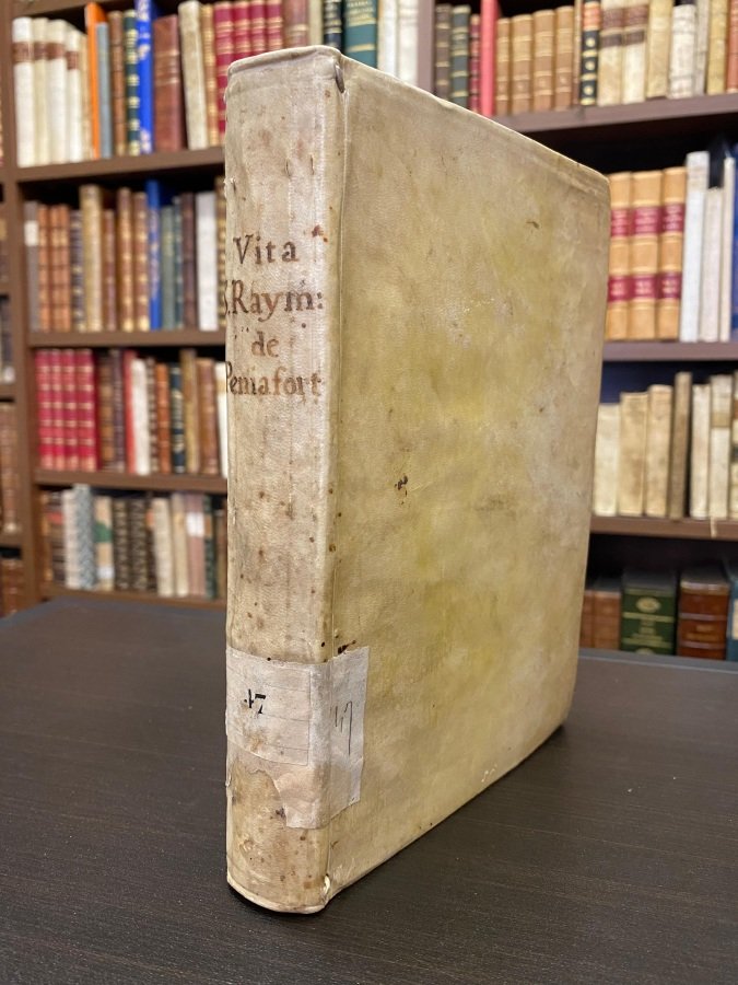 In-4° (cm. 20,8), genuina legatura coeva in piena pergamena con titolo manoscritto e cartellino al dorso, tagli azzurri; pp. [8] 381 [11] con un suggestivo ritratto del santo domenicano inciso in rame al frontespizio; fioriture sparse, antiche integrazioni al margine di qualche carta, sporadiche gore marginali e piccoli segni di tarlo a poche carte; antiche firme di appartenenza al frontespizio. Edizione originale non comune della biografia di Raimondo di Penyafort pubblicata nell'anno della sua canonizzazione (fu terzo generale dei Domenicani, gloria dell’Ordine ma anche maestro di cultura giuridica all’Università di Bologna). L'autore, canonista aragonese, scrisse poi in materia d'inquisizione. Buon esemplare. (SD1)