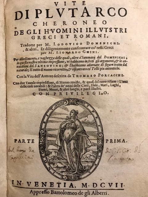 Vite [.] de gli huomini illustri greci et romani tradotte per m. Lodovico Domenichi et altri et diligentemente confrontate co' testi greci per m. Lionardo Ghini [.]. | Libri antichi e moderni | Plutarco.