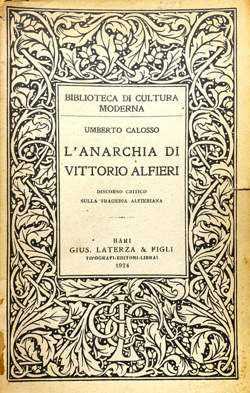 I ed.. VIII/ XVIII+156/ rilegatura in mezza similpelle rossa con titoli dorati al dorso. Con 3 tavole f.t. illustrate in b/n. Stato buono (copertina non originale - pagine brunite). Indice: Prefazione; C. Lombroso - Contributo allo studio della psico-patologia di Vittorio Alfieri; Dott. G. Antonini. Bergamo, 29 dicembre 1897 (Esame dell'autobiografia (Infanzia-Germi delle anomalie del sentimento e della volontà-Precoce tentativo di suicidio-Ipereccitabilità-Violenze - Adolescenza-Malattie-Stato nevrastenico permanente-Melanconia-Precocità sessuale-Senso estetico-Fantasia - Giovinezza-Periodi di depressione e di esaltamento - Impulsione ambulatoria-Viaggi-Amore morboso-Equivalente epilettico-Vero accesso di epilessia psico-motoria-Sensibilità meteorica - Manifestazioni precoci di genialità-Amore alla lettura-Poesia-Pensiero politico-Paranoia rudimentale-Atavismo - Malattia e ravvedimento-Debolezza di volontà-Incertezze, titubanze-Lotta per due anni-Primo abbozzo di tragedia - Studii-Utopie-Rifugge dalla vita sociale attiva-Passione amorosa-Lavoro intermittente-Ossessioni-Cambiamenti d'umore-Gotta-Altro equivalente epilettico-Malattia grave - Cronologia delle opere-Influenza meteorica sulla produzione geniale-Natura dell'estro - Involuzione senile-Esame del "Misogallo"-Sintomi di indebolimento mentale-Sitofobia - Tentativo di ricerca fisionomica - Contributo allo studio grafologico)) - Appendice; Dott. Cognetti De Martiis (L'eredità nell'Alfieri (Gli Alfieri ed i Tournon) - Esame psichiatrico di Vittorio Alfieri - Il genio di Vittorio Alfieri).