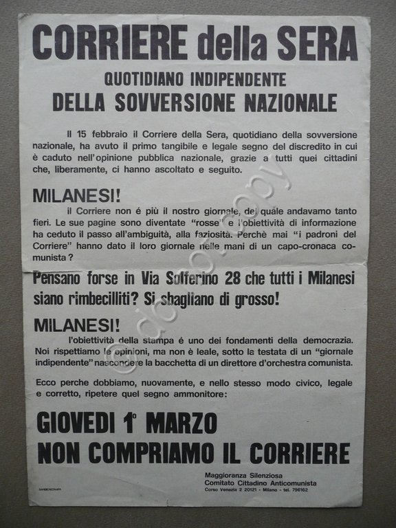 Volantino, Corriere della Sera quotidiano indipendente della sovversione nazionale Barberi Stampa, Milano, s.d. (anni '50 / '60 del Novecento), volantino a stampa su carta, cm 22x15,5. Condizioni di conservazione Esemplare in buone condizioni con tracce d'uso, piega centrale di conservazione, margini e angoli con alcuni piccoli difetti e qualche lieve traccia di pieghetta, un estremità della piega centrale con strappetto di un paio di cm, retro con alcune tracce di sporco. Volantino a stampa in cui si vuole boicottare il Corriere della Sera : Perché mai i 'padroni del Corriere' hanno dato il loro giornale nelle mani di un capo-cronaca comunista? / Pensano forse in Via Solferino 28 che tutti i Milanesi siano rimbecilliti? Si sbagliano di grosso! [.] Giovedì 1 Marzo non compriamo il Corriere." "
