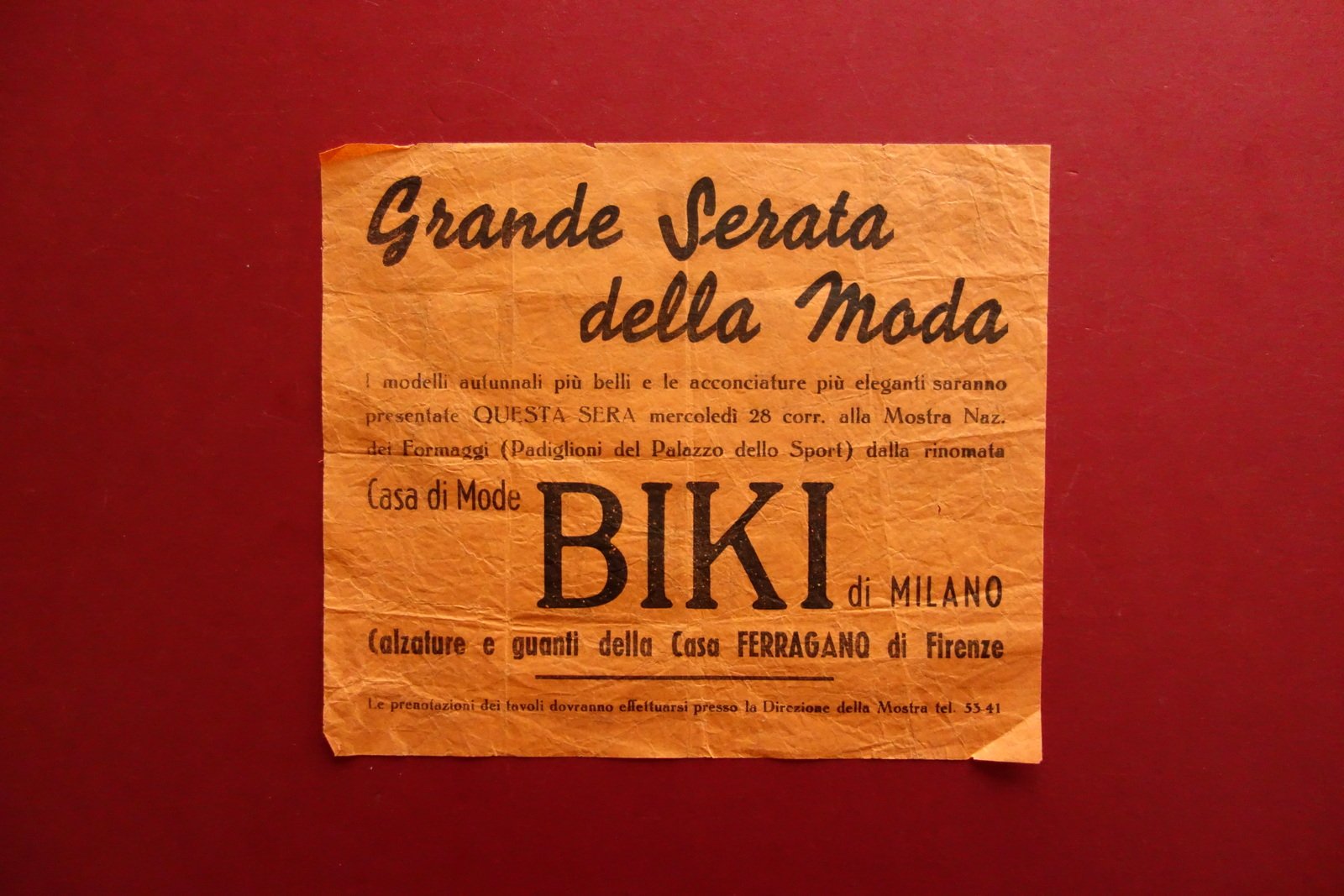 S. d. ma anni '30 del Novecento; volantino a stampa su carta arancio simil velina. Retro bianco. Cm 16,5x19.