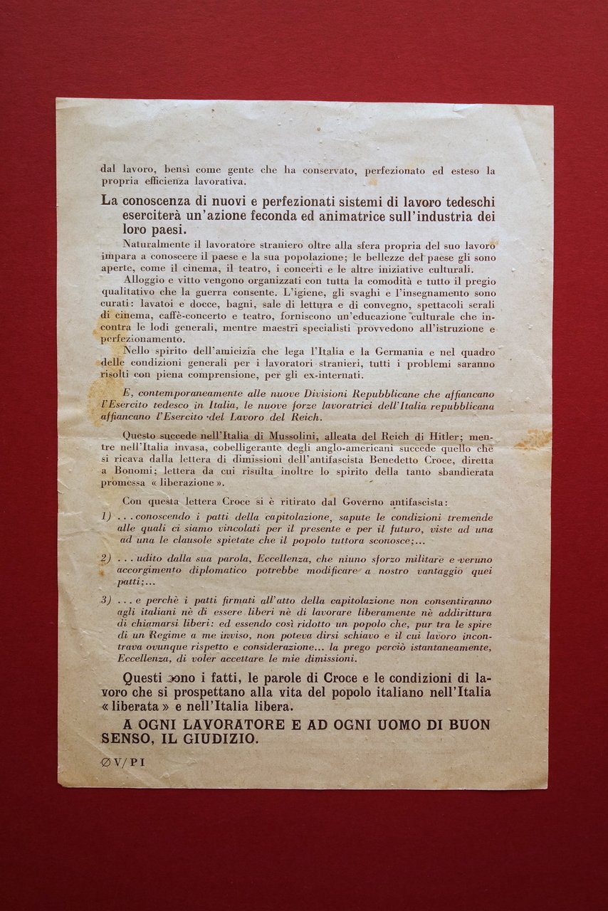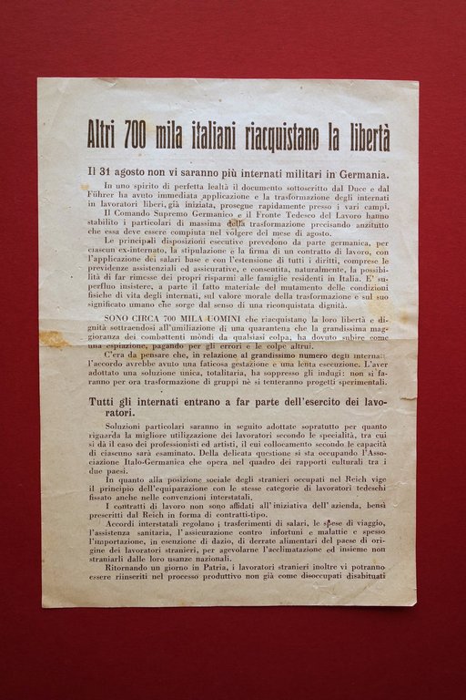 Volantino, Altri 700 mila Italiani riacquistano la libertà il 31 agosto non vi saranno più internati militari in Germania. In uno spirito di perfetta lealtà il documento sottoscritto dal Duce e dal Fuhrer ha avuto immediata applicazione e la trasformazione degli internati in lavoratori liberi, già iniziata, prosegue rapidamente presso i vari campi. [.]" V/PI, s. d. ma 1943; volantino originale a stampa su foglio in carta; testo ad entrambi i lati. Cm 22x16. Condizioni di conservazione Esemplare in buone condizioni con leggere tracce d'uso, traccia di piega centrale di conservazione, qualche leggera brunitura. Margine esterno sinistro con un minimo strappetto. Raro. Originale. SC03.D16183 N "