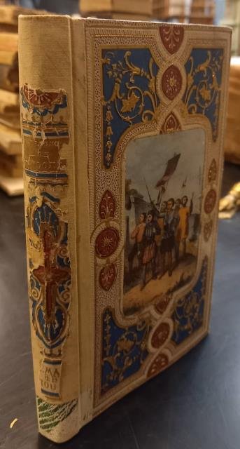 Testo francese. Traduzione dall'inglese di Henri Lebrun. 11^edizione. Cm.17,5x10,3. Pg.286. Deliziosa legatura cartonata, con rinforzo in tela al dorso, con suggestive decorazioni in oro, blue e rosso ai piatti, con vignetta policroma. Tagli in oro. Incisioni xilografiche fuori testo. Doppio frontespizio, il primo, figurato, semistaccato. Capitoli dedicati a Alonzo de Ojeda, Pedro Alonzo Nino, Cristoval Guerra, Vincente Yanez Pinzon, Diego de Lope, Rodrigo de Bastidas, Diego de Nicuesa, Vasco Nunez de Balboa, Juan Ponce de Leon. Codice libreria 173054.
