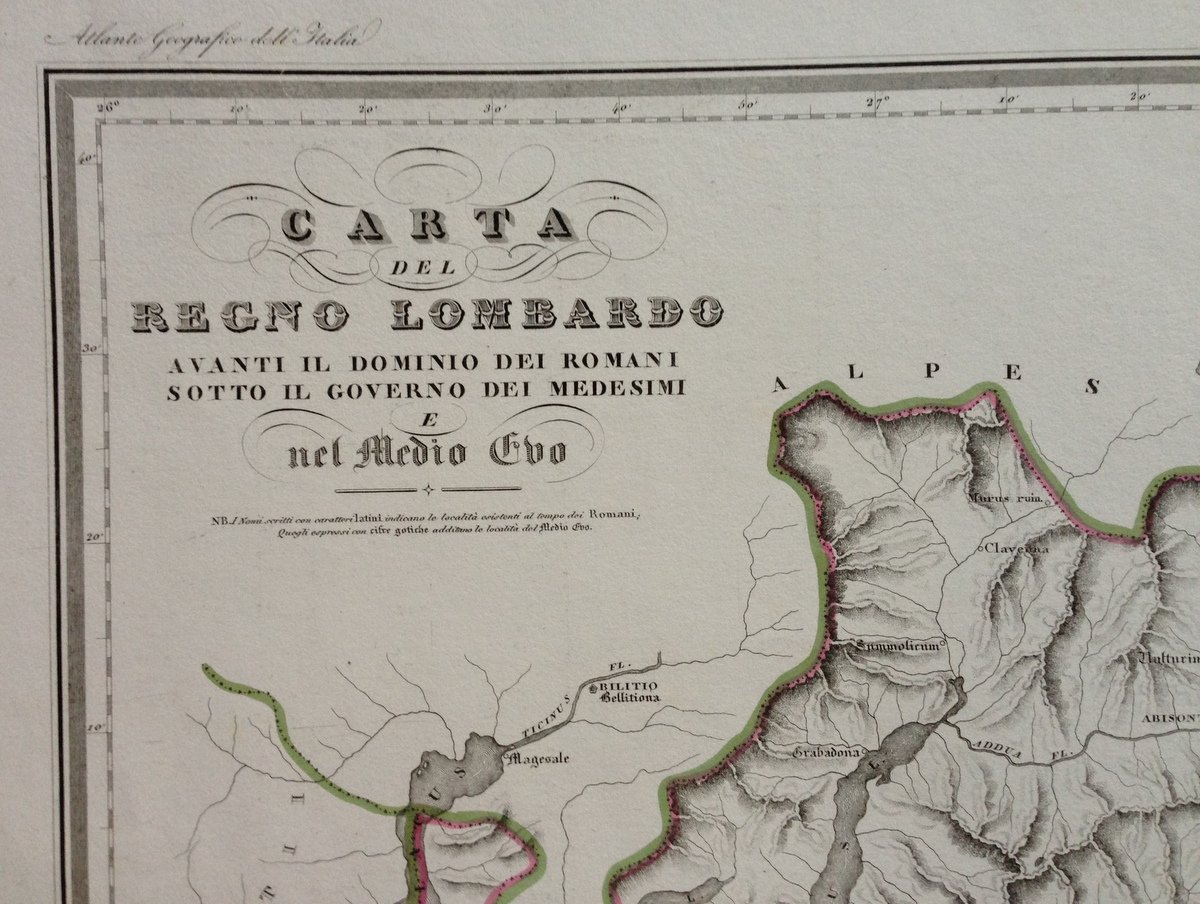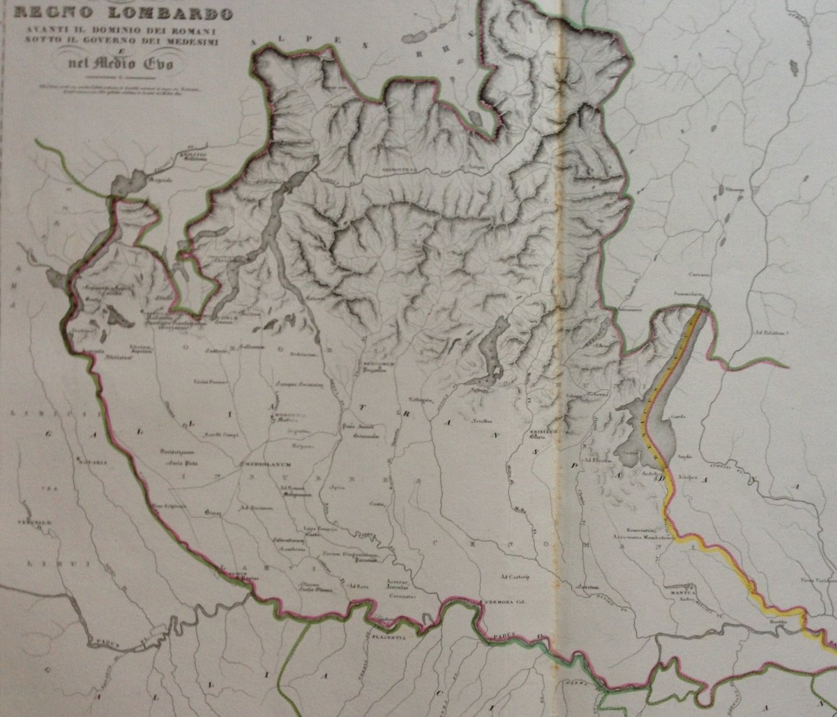 Stampa antica originale acquaforte, Carta del del Regno Lombardo avanti il dominio dei Romani sotto il Governo dei medesimi e nel Medio Evo tratto da ATLANTE GEOGRAFICO DEGLI STATI ITALIANI COROGRAFIA FISICA STORICA E STATISTICA DELL'ITALIA di Attilio Zuccagni - Orlandini