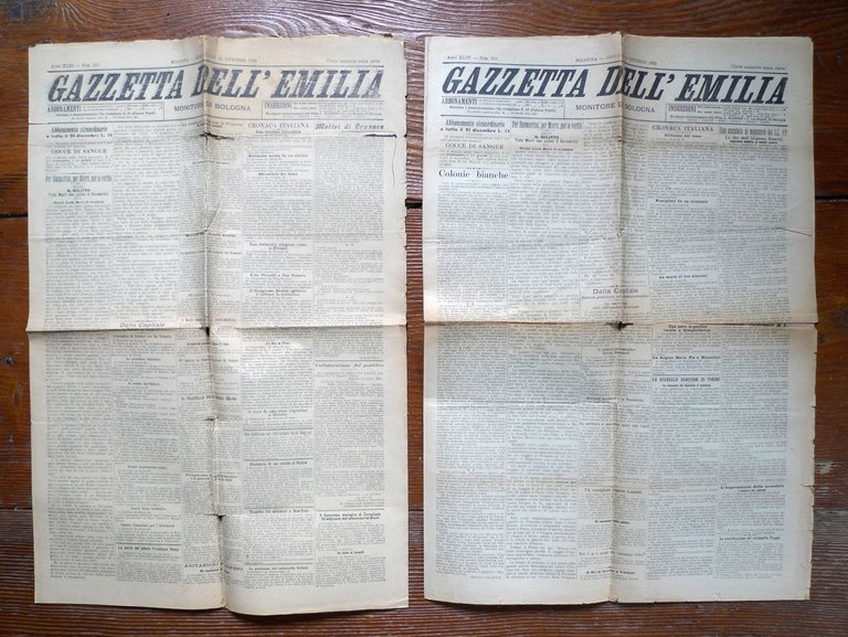 GAZZETTA DELL'EMILIAMONITORE DI BOLOGNAQuotidianoAnno XLIII n.293 Bologna Giovedì 23 Ottobre 1902Anno XLIII n.292 Bologna Mercoledì 22 Ottobre 190261x41, pp.4,peso: g.300cod.R3CONDIZIONI DEI QUOTIDIANI: accettabili,piegati in 4,pagine ingiallite,strappetti,n.293: uno strappo attraversa quasi tutta la pagina