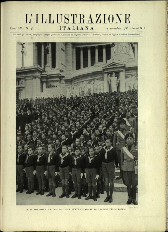 In-4, brossura. In buono stato di conservazione. In questo numero:Il IV Novembre a Roma: Balilla e Piccole italiane sull'Altare della Patria.