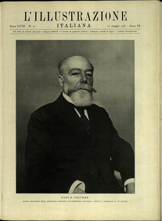 In-4, brossura. In buono stato di conservazione. In questo numero:Paolo Doumer eletto Presidente della Repubblica francese dall'Assemblea nazionale riunita a Versailles il 13 maggio.
