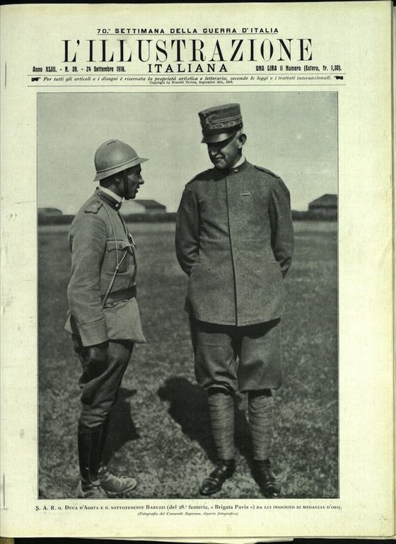 In-4, brossura. In buono stato di conservazione. In questo numero:S. A. R. il Duca d'Aosta e il sottotenente Baruzzi (del 28° fanteria Brigata Pavia) da lui insignito di medaglia d'oro.