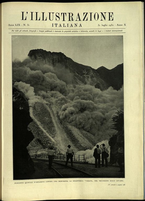 In-4, brossura. In buono stato di conservazione. In questo numero:Duecento quintali d'esplosivo contro una montagna: la gigantesca varata' del Tecchione sulle Apuane.