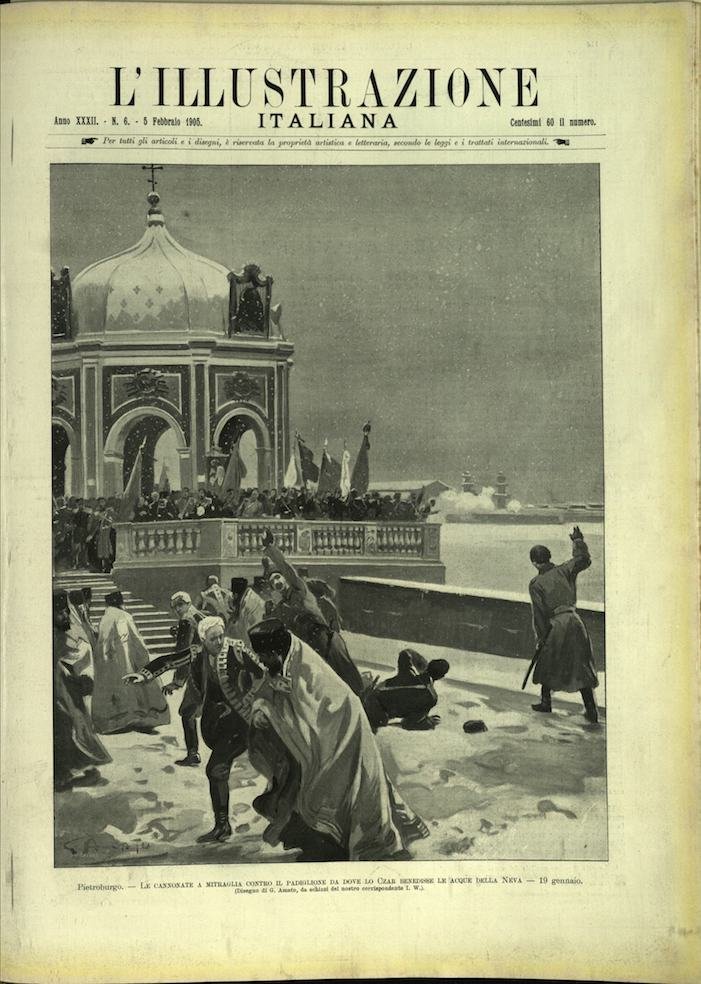 In-4, brossura. In buono stato di conservazione. In questo numero:Pietroburgo - Le cannonate a mitraglia contro il padiglione da dove lo Czar benedisse le acque della Neva.