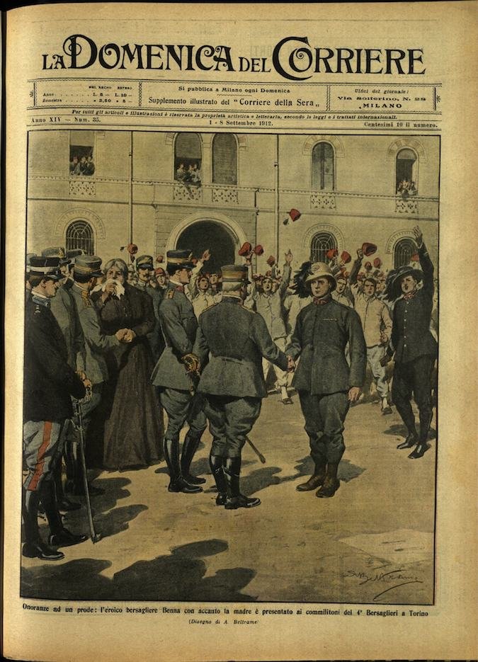 In-4, brossura, in buono stato di conservazione. In questo numero:"La poesia della guerra, le ultime canzoni popolari ispirate alla guerra in Libia vengono ora cantate nelle vie di Napoli.""Onoranze ad un prode, l'eroico bersagliere Benna con accanto la madre è presentato ai commilitoni del 4° Bersaglieri a Torino.".