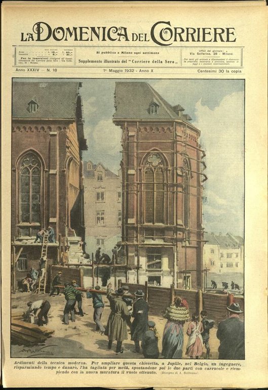 In-4, brossura, in buono stato di conservazione. In questo numero:"La vendita all'asta delle belve del circo Schneider a Napoli. I magistrati, i banditori e la folla, mentre invano si chiede chi voglia acquistare il lotto di 59 leoni e 2 tigri al prezzo di 372.790 lire. Soltanto un lama, due cervi, un'aquila e alcuni cani hanno trovato benevoli compratori.""Ardimenti della tecnica moderna. Per ampliare questa chiesetta, a Jupille, nel Belgio, un ingegnere, risparmiando tempo e danaro, l'ha tagliata per meta, spostandone poi le due parti con carrucole e riempiendo con la nuova muratura il vuoto ottenuto.".