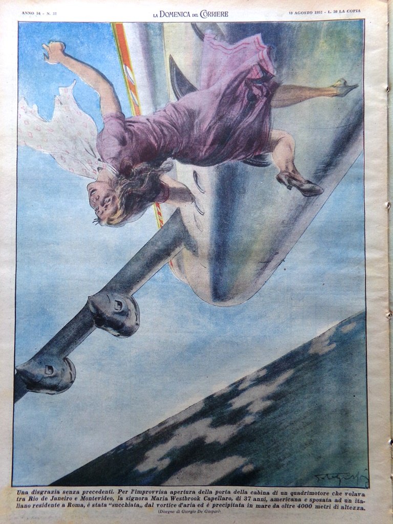 Per l'improvvisa apertura della porta della cabina di un quadrimotore che volava tra Rio de Janeiro e montevideo, La signora Maria Westbrook Capellaro è stata "succhiata" dal vortice d'aria ed è precipitata in mare da oltre 4000 metri d'altezza (Giorgio De Gaspari)