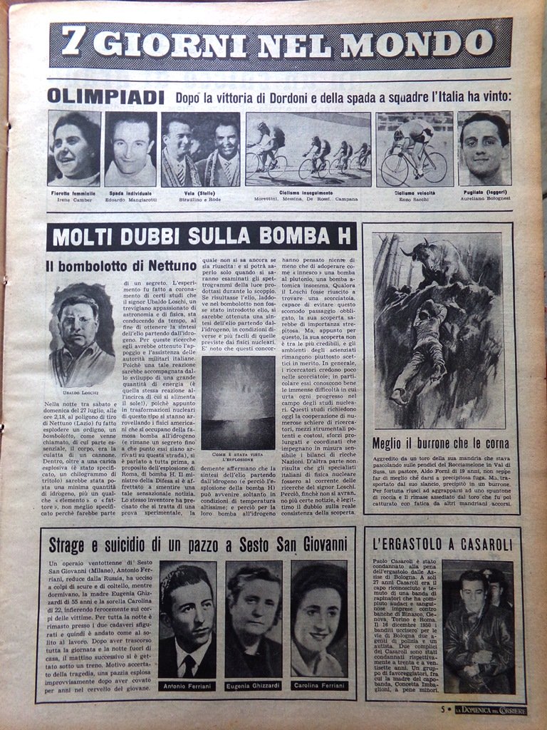 7 giorni nel mondo: molti dubbi sulla Bomba H, olimpiadi: dopo la vittoria di Dordoni e della spada a squadre l'Italia ha vinto, l'ergastolo a Paolo Casaroli