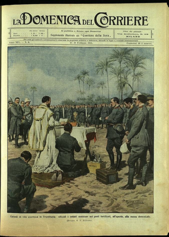 In-4, brossura, in buono stato di conservazione. In questo numero:"Carovane militari dirette da Tripoli ai forti recando provviste, investite dal ghibli il terribile vento del deserto.""Episodi di vita guerresca in Tripolitania, ufficiali e soldati assistono nei posti fortificati, all'aperto, alla messa domenicale.".