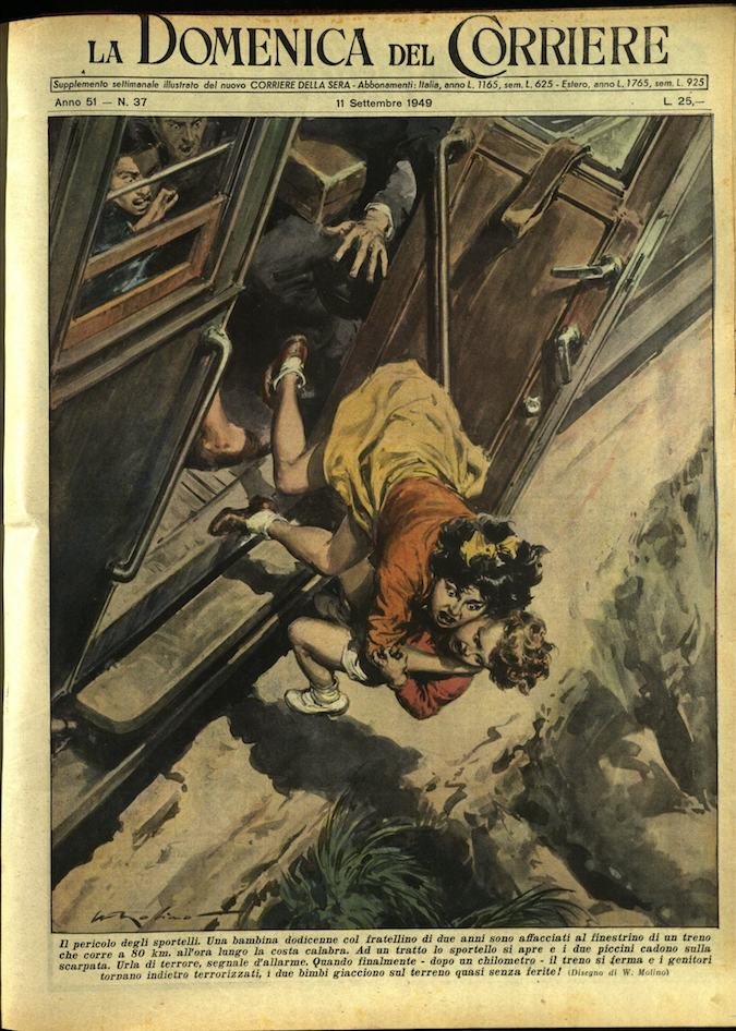 In-4, brossura, in buono stato di conservazione. In questo numero:"Il pericolo degli sportelli. Una bambina dodicenne col fratellino di due anni sono affacciati al finestrino di un treno che corre a 80 km all'ora lungo la costa calabra. Ad un tratto lo sportello si apre e i due piccini cadono sulla scarpata. Urla di terrore, segnale d'allarme. Quando finalmente - dopo un chilometro - il treno si ferma e i genitori tornano indietro terrorizzati, i due bimbi giacciono sul terreno quasi senza ferite!""Vietati i calzoncini! In parecchie localita italiane gli agenti hanno costretto molte turiste straniere, che circolavano in pantaloncini, a rientrare in albergo e mutare d'abito. Una buffa scenetta si è svolta a Roma in piazza Barberini dove le guardie hanno fermato alcune americane in prendisole lasciando invece indisturbato un vecchietto che le accompagnava, nonostante egli sfoggiasse soltanto i pantaloncini con una maglietta svolazzante..".
