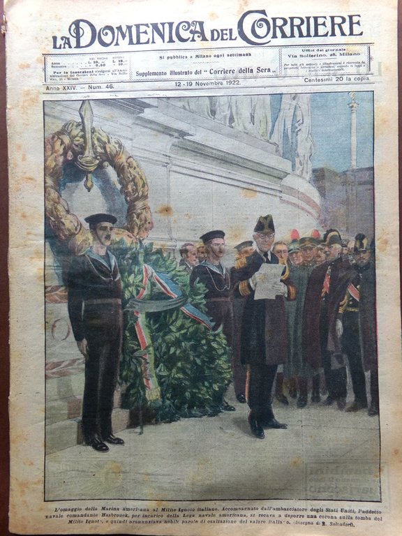 L'omaggio della Marina americana al Milite Ignoto italiano. Accompagnato dall'ambasciatore degli Stati Uniti, l'addetto navale comandante Hasbrouck, per incarico della Lega navale americana, si recava a deporre una corona sulla tomba del Milite Ignoto, e quindi pronunziava nobili parole di esaltazione del valore italiano (R. Salvadori)
