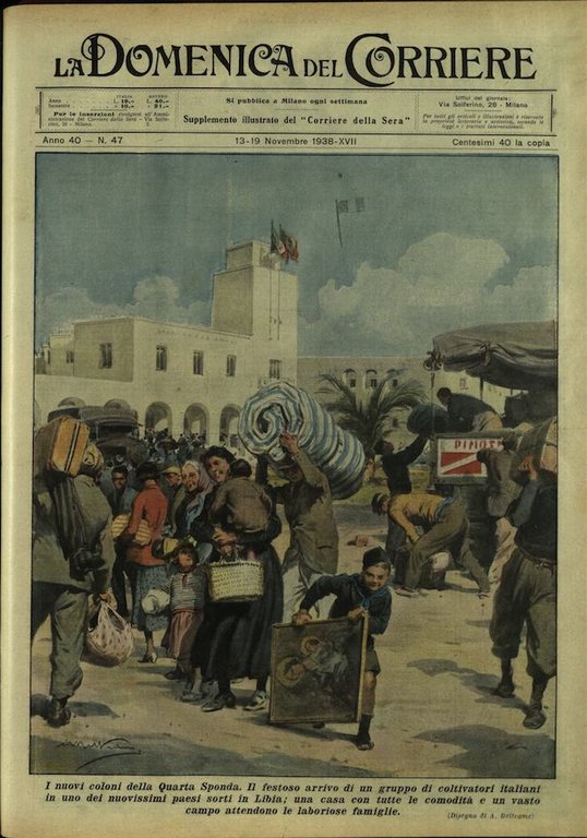 In-4, brossura, in buono stato di conservazione. In questo numero:"I nuovi coloni della Quarta Sponda. Il festoso arrivo di un gruppo di coltivatori italiani in uno dei nuovissimi paesi sorti in Libia; una casa con tutte le comodita e un vasto campo attendono le laboriose famiglie.""Malviventi in brutte mani.. Tre banditi di Nuova York, che erano entrati a rivoltella spianata in un istituto di bellezza sperando di fare un buon colpo, sono stati energicamente affrontati dalle clienti e dalle manicure a colpi di forbici, di lime e di altri attrezzi del mestiere, e respinti.".