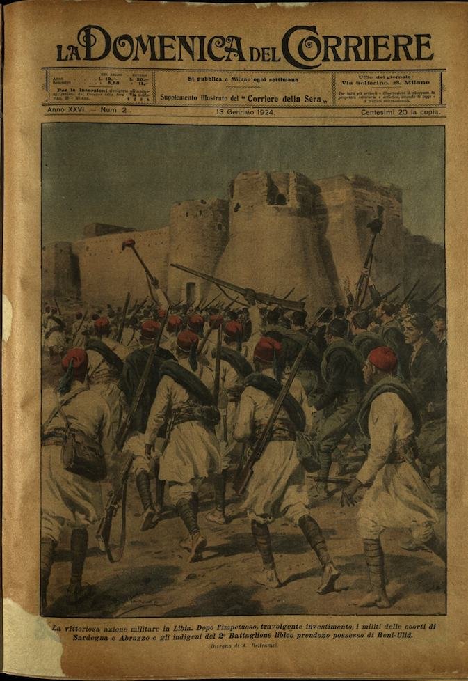 In-4, brossura, in buono stato di conservazione. In questo numero:"La scienza dei pugni in alto mare. Lo sport della boxe è diventato così popolare tra i marinai della flotta americana, che non di rado a bordo delle grandi navi da guerra, in piena navigazione, si puo assistere a scontri in perfetta regola, sopra un ring modello.""La vittoriosa azione militare in Libia. Dopo l'impetuoso, travolgente investimento, i militi delle coorti di Sardegna e Abruzzo e gli indigeni del 2° Battaglione libico prendono possesso di Beni-Ulid.".