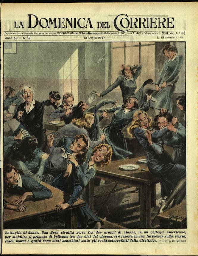 In-4, brossura, in buono stato di conservazione. In questo numero:"Uno sport improvvisato. Durante l'ora di riposo, gli operai di una fabbrica inglese si sono sfidati ad una gara atletica di nuovo genere, facendo rotolare nel cortile dello stabilimento colossali ruote di grossissima corda.""Battaglia di donne. Una fiera rivalita sorta fra due gruppi di alunne, in un collegio americano, per stabilire il primato di bellezza tra due divi del cinema, si è risolta in una furibonda zuffa. Pugni, calci, morsi e graffi sono stati scambiati sotto gli occhi esterrefatti della direttrice.".