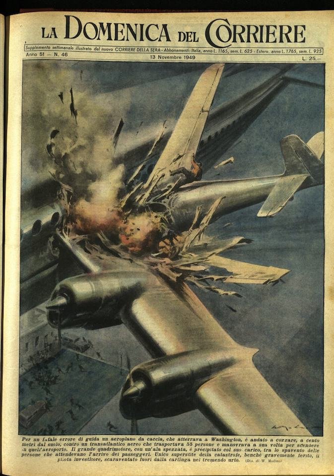 In-4, brossura, in buono stato di conservazione. In questo numero:"Un corteo funebre stava varcando il fiume Rabbi, a San Savino di Predappio, sopra una passerella di legno. La bara, portata a spalle, aveva già raggiunto la sponda opposta quando il ponticello, sotto il peso di coloro che seguivano il feretro, si schiantava e una diecina di persone precipitavano sul greto del fiume.""Per un fatale errore di guida un aeroplano da caccia, che atterrava a Washington, è andato a cozzare, a cento metri dal suolo, contro un transatlantico aereo che trasportava 55 persone e manovrava a sua volta per scendere in quell'aeroporto. Il grande quadrimotore, con un'ala spezzata, e precipitato col suo carico, tra lo spavento delle persone che attendevano l'arrivo dei passeggeri. Unico superstite della catastrofe, benche gravemente ferito, il pilota investitore, scaraventato fuori dalla carlinga nel tremendo urto.".