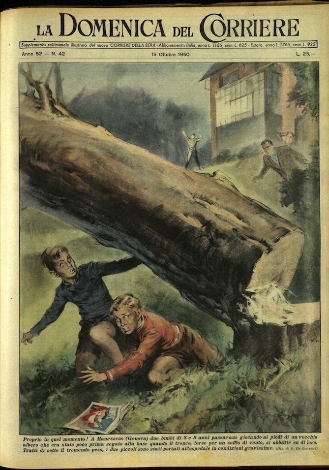 In-4, brossura, in buono stato di conservazione. In questo numero:"Proprio in quel momento! A Manasseno (Genova) due bimbi di 8 e 9 anni passavano giocando ai piedi di un vecchio albero che era stato poco prima segato alla base quando il tronco, forse per un soffio di vento, si abbatte su di loro. Tratti di sotto il tremendo peso, i due piccoli sono stati portati all'ospedale in condizioni gravissime.""Spavento ma nessun danno. In Belgio, sulla strada di Mons, l'automobile su cui erano la Regina madre del Belgio Elisabetta e la sedicenne nipotina Maria Pia, figlia di Umberto di Savoia, ha urtato con grande violenza contro un'altra macchina che la precedeva. Tanto la Regina quanto la principessa sono però rimaste illese.".