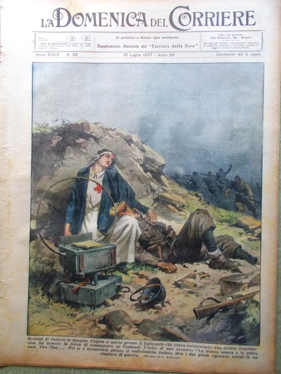 Eroismi di italiani in Spagna. Colpita a morte presso il legionario che stava soccorrendo un'eroica crocerossina ha trovato la forza di comunicare al comando l'esito di uno scontro, poi si è accasciata presso il radiofonista caduto (Achille Beltrame)