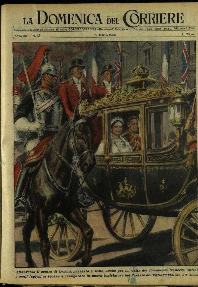 In-4, brossura, in buono stato di conservazione. In questo numero:"L'addio di Roma alla piccola Annarella. Sotto una pioggia di fiori, una moltitudine immensa ha seguito i funerali della bimba barbaramente uccisa nel sobborgo di Primavalle. La salma, vestita con l'abito della prima comunione, era deposta su una candida berlina tirata da quattro cavalli bianchi, come nelle fiabe.""Attraverso il centro di Londra, pavesato a festa, anche per la visita del Presidente francese Auriol, i reali inglesi si recano a inaugurare la nuova legislatura nel Palazzo del Parlamento.".