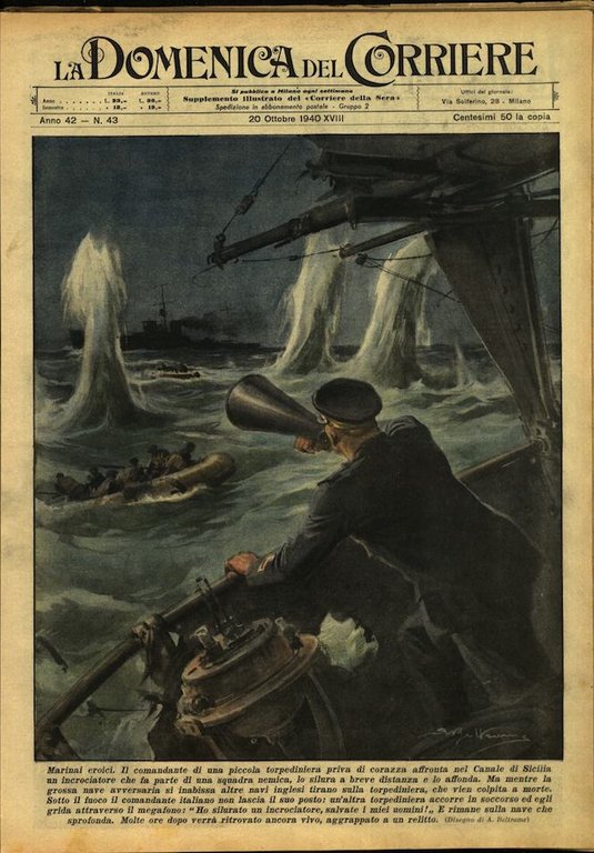 In-4, brossura, in buono stato di conservazione. In questo numero:"Imprevisti della battaglia. Mentre infuriava una battaglia aerea sull'Inghilterra, un caccia inglese colpito dagli aviatori tedeschi e precipitato in fiamme, e nella caduta ha investito un altro caccia britannico. Cosi, tragicamente uniti, i due apparecchi si sono abbattuti al suolo.""Marinai eroici. Il comandante di una piccola torpediniera priva di corazza affronta nel Canale di Sicilia un incrociatore che fa parte di una squadra nemica, lo silura a breve distanza e lo affonda. Ma mentre la grossa nave avversaria si inabissa altre navi inglesi tirano sulla torpediniera, che vien colpita a morte. Sotto il fuoco il comandante italiano non lascia il suo posto, un'altra torpediniera accorre in soccorso ed egli grida attraverso il megafono, Ho silurato un incrociatore, salvate i miei uomini! E rimane sulla nave che sprofonda. Molte ore dopo verra ritrovato ancora vivo, aggrappato a un relitto.".