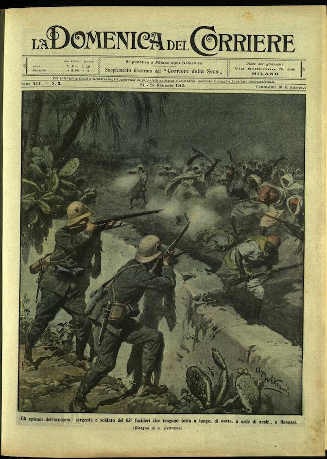 In-4, brossura, in buono stato di conservazione. In questo numero:"Gli episodi dell'eroismo, sergente e soldato del 63° fucilieri che tengono testa a lungo, di notte, a orde di arabi, a Bengasi.""Durante una ricognizione oltre Ain-Zara i lancieri Firenze scoprono il nemico e tornano a precipizio a darne notizia.".