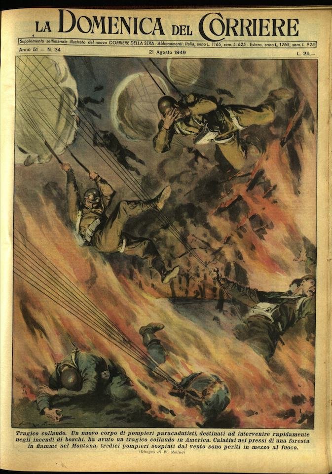 In-4, brossura, in buono stato di conservazione. In questo numero:"Tragico collaudo. Un nuovo corpo di pompieri paracadutisti, destinati ad intervenire rapidamente negli incendi di boschi, ha avuto un tragico collaudo in America. Calatisi nei pressi di una foresta in fiamme nel Montana, tredici pompieri sospinti dal vento sono periti in mezzo al fuoco.""Il caldo e le vivande. più di cento casi di avvelenamento per cibi guasti si sono verificati in un sol giorno alla periferia di Napoli. Un lieto banchetto nuziale è terminato in modo quasi tragico quando gli sposi e tutti gli invitati sono stati colti - durante il pranzo stesso - da violenti e preoccupanti dolori viscerali.".