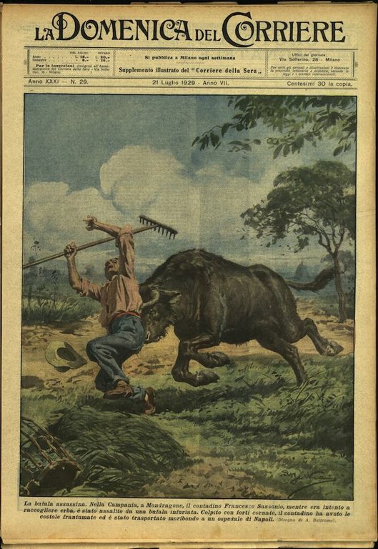 In-4, brossura, in buono stato di conservazione. In questo numero:La bufala assassina. Nella Campania, a Mondragone, il contadino Francesco Sassonio, mentre era intento a raccogliere erba, è stato assalito a una bufala infuriata. Colpito con forti cornate, il contadino ha avuto le costole frantumate ed è stato trasportato moribondo ad un ospedale di Napoli."Una strage di cavalli da corsa. A Farmsen, presso Amburgo, il fuoco, alle due del mattino, è scoppiato in una grande scuderia che accoglieva 35 cavalli. I guardiani hanno cercato di sciogliere i legami degli animali; ma alcuni di questi erano già avvolti dalle fiamme. Gli altri avevano preso la fuga in tutte le direzioni; ma, ad un tratto, accecati dal terrore, una decina di essi sono tornati verso la scuderia in fiamme e vi sono fulmineamente penetrati, prima che i guardiani potessero impedirlo. I poveri animali hanno così trovato quella morte cui erano già scampati.".