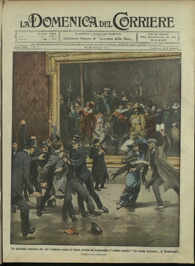 In-4, brossura, in buono stato di conservazione. In questo numero:"La fedelta di un bulldog che si lascia avvelenare e muore sul corpo del padrone pruttosto che permettere l'intervento dei policemen.""Ex marinaio olandese che, per vendetta contro lo Stato, rovina ad Amsterdam il celebre quadro La ronda notturna di Rembrandt.".