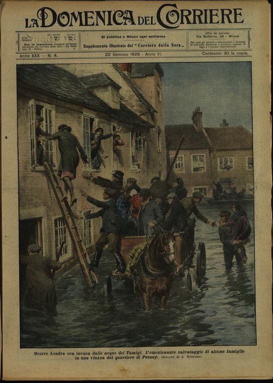In-4, brossura, in buono stato di conservazione. In questo numero:Mentre londra era invasa dalle acque del Tamigi. L'emozionante salvataggio di alcune famiglie in una viuzza del quartiere di Putney."Un treno contro un muro. Per una improvvisa rottura dei freni, un treno viaggiatori, proveniente da Amsterdam, deragliava nelle vicinanze della stazione di Zandvoort e andava a cozzare contro un muro. La locomotiva non fu fermata dall'ostacolo, ma lo abbatte e continuo la corsa per una cinquantina di metri. Il fuochista rimaneva gravemente ferito. Un solo viaggiatore fu ucciso; diversi altri riportarono ferite leggere.".