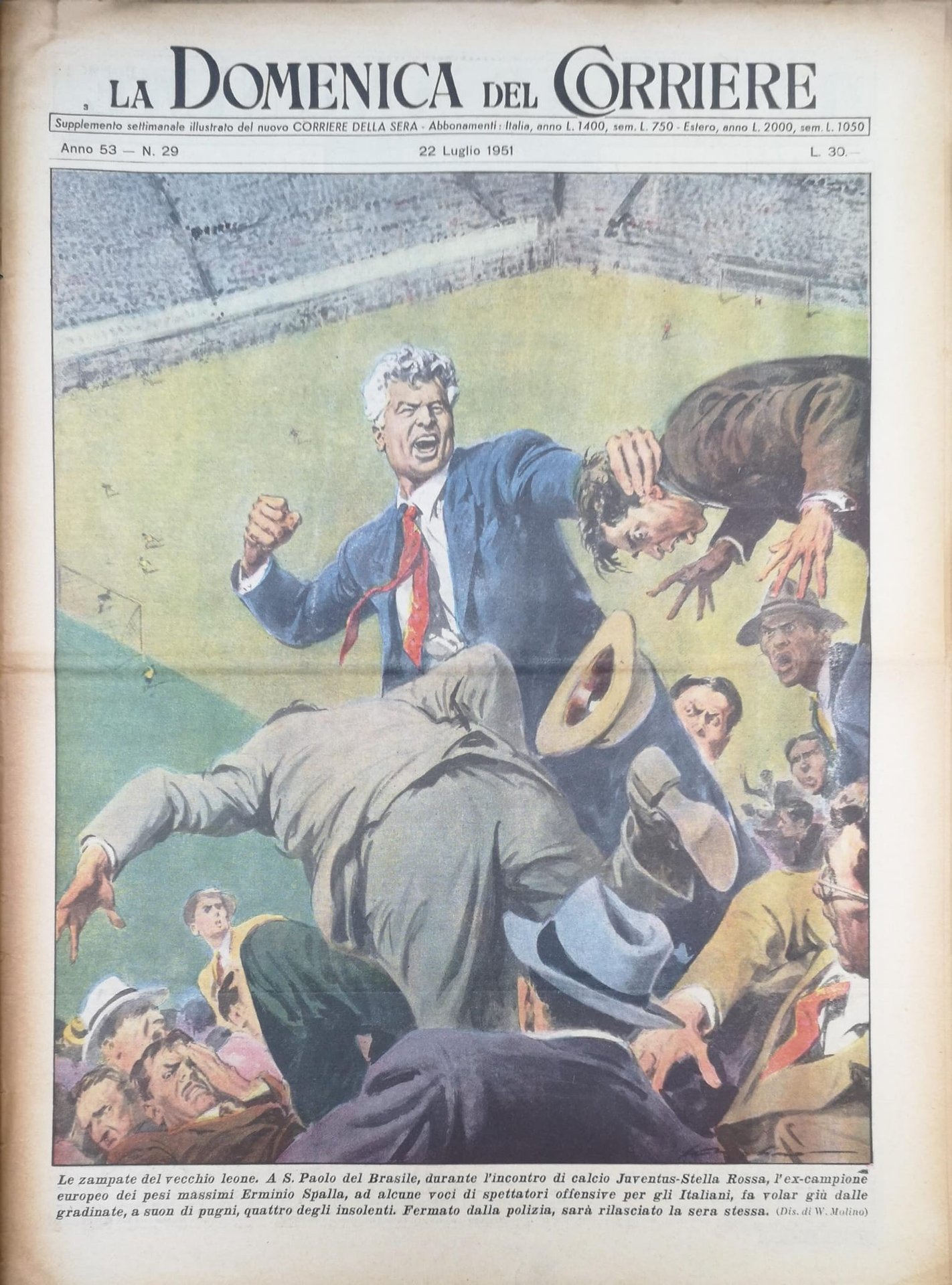 In-4, brossura, in buono stato di conservazione. In questo numero:"Le zampate del vecchio leone. A S Paolo del Brasile, durante l'incontro di calcio Juventus-Stella Rossa, l'ex-campione europeo dei pesi massimi Erminio Spalla, ad alcune voci di spettatori offensive per gli Italiani, fa volar giù dalle gradinate, a suon di pugni, quattro degli insolenti. Fermato dalla polizia, sara rilasciato la sera stessa.""Caccia ai bufali in piena Bari. Quattro di queste bestie, che si stavano trasportando al macello, si sono inferocite liberandosi dai legami e lanciandosi a tutta carriera per le strade fra il terrore dei passanti. Per fortuna il tenente della polizia Mario degli Effetti le ha affrontate coraggiosamente, prima cercando di arrestarne la furiosa corsa, poi abbattendole una dopo l'altra col moschetto mentre a testa bassa cercavano di caricarlo.".