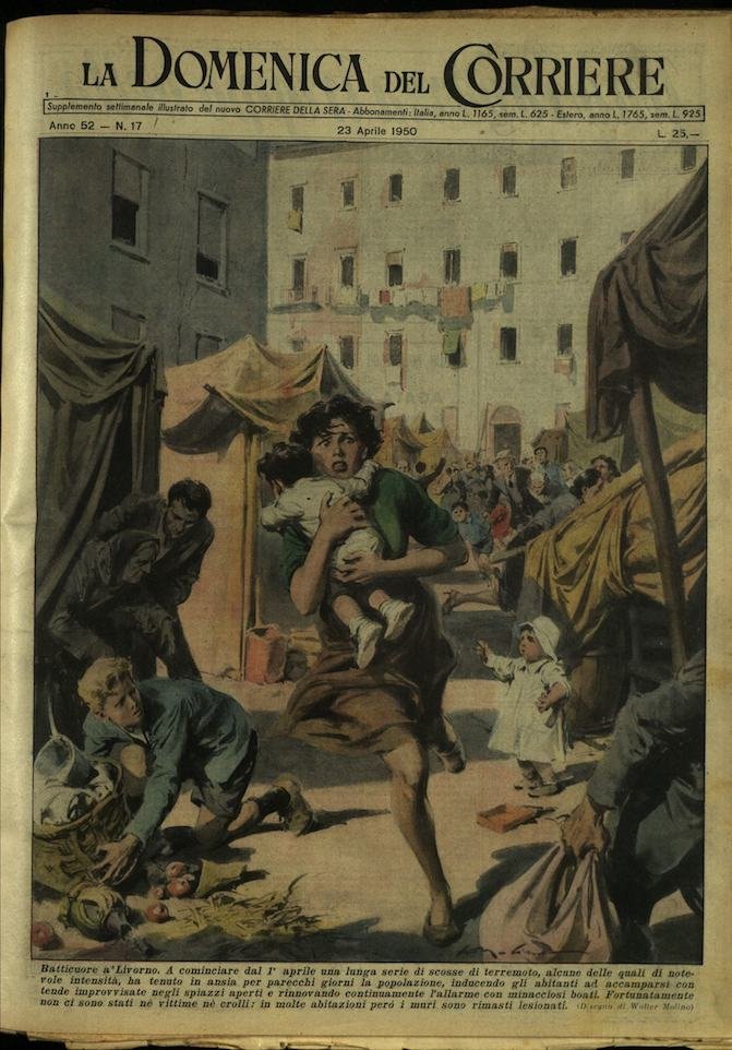In-4, brossura, in buono stato di conservazione. In questo numero:"Batticuore a Livorno. A cominciare dal 1° aprilee una lunga serie di scosse di terremoto, alcune delle quali di notevole intensita, ha tenuto in ansia per parecchi giorni la popolazione, inducendo gli abitanti ad accamparsi con tende improvvisate negli spiazzi aperti e rinnovando continuamente l'allarme con minacciosi boati. Fortunatamente non ci sono stati né vittime né crolli, in molte abitazioni però i muri sono rimasti lesionati.""Benedizione alla mamma. Una scena commovente alle porte di Gorizia, la dove passa il confine. Un giovane prete italiano, don Breceli, che al mattino ha celebrato la prima messa, si avvicina al reticolato di frontiera di la del quale lo aspetta sua madre, residente in territorio jugoslavo e unica superstite della famiglia massacrata nella lotta partigiana. Inginocchiatasi la donna, il figlio, attraverso l'invalicabile barriera, le impartisce la benedizione.".