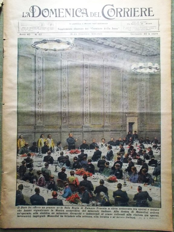 Il duce ha offerto un pranzo ne la Sala Regia di Palazzo Venezia a circa 700 fra operai e tecnici che hanno organizzato la Mostra autarchica del minerale italiano. Alla destra di Mussolini sedeva un'operaia, alla sinistra un minatore (Achille Beltrame)