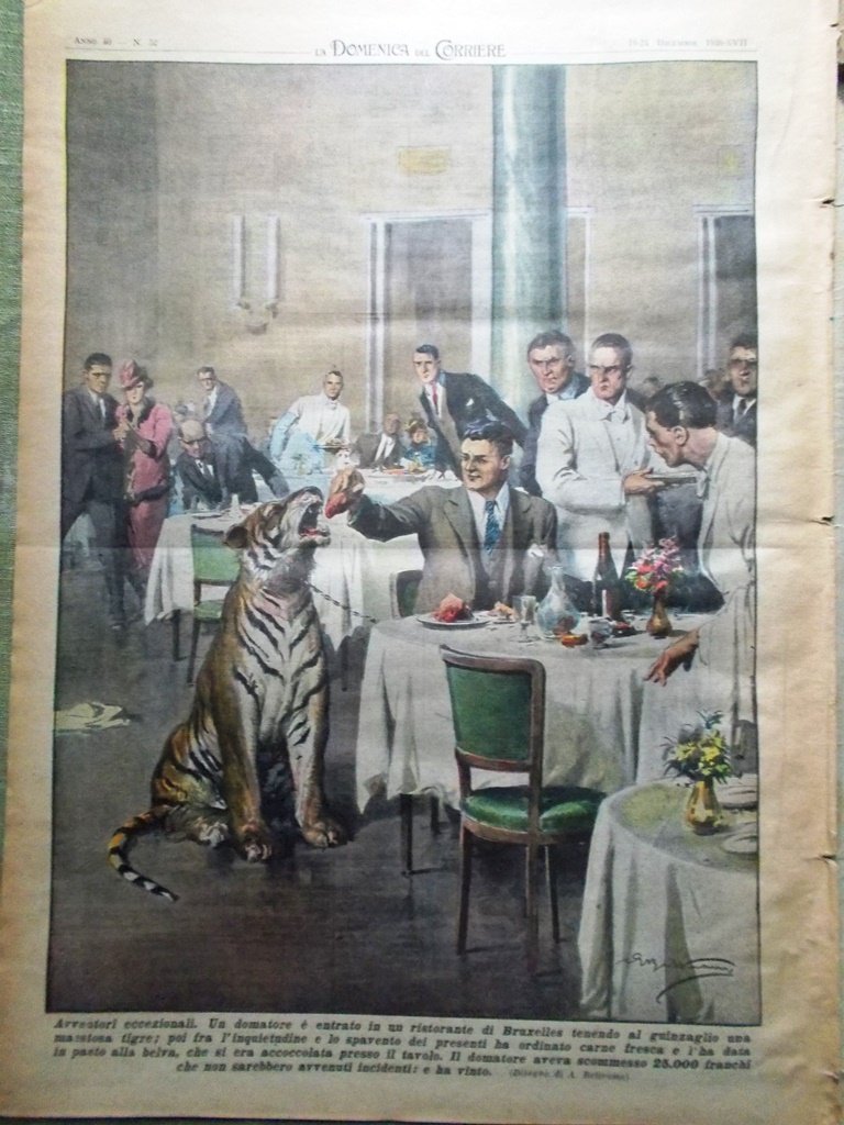 Un domatore è entrato in un ristorante di Bruxelles tenendo al guinzaglio una maestosa tigre; poi fra l'inquietudine e lo spavento dei presenti ha ordinato carne fresca e l'ha data in pasto alla belva. Il tutto è avvenuto senza incidenti (Achille Beltrame)