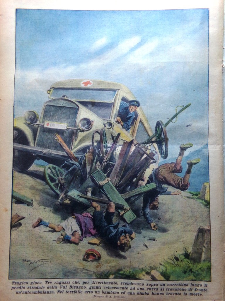 Tragico gioco. Tre ragazzi che, per divertimento, scendevano sopra un carrettino lungo il pendio stradale della Val Bisagno, giunti velocemente a una curva si trovarono di fronte un'autoambulanza. Un bambino e una bambina hanno trovato la morte nell'urto (Achille Beltrame)
