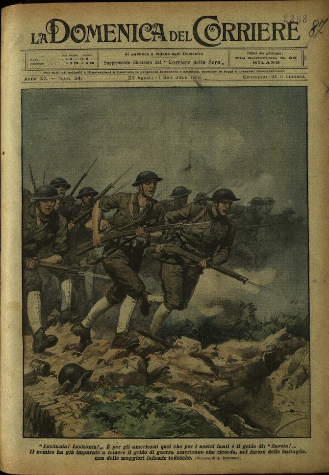 In-4, brossura, in buono stato di conservazione. In questo numero:"Una curiosa applicazione del cinematografo per i feriti. In molti ospedali americani in Francia, per divertire i feriti costretti all'immobilita, si è trovato il modo per mezzo di apparecchi portatili, di proiettare delle pellicole cinematografiche sul soffitto delle corsie.""Lusitania! Lusitania! E per gli americani quel che per i nostri fanti e il grido di, Savoia! Il nemico ha già imparato a temere il grido di guerra americano che ricorda, nel furore delle battaglie, una della maggiori infamie tedesche.".