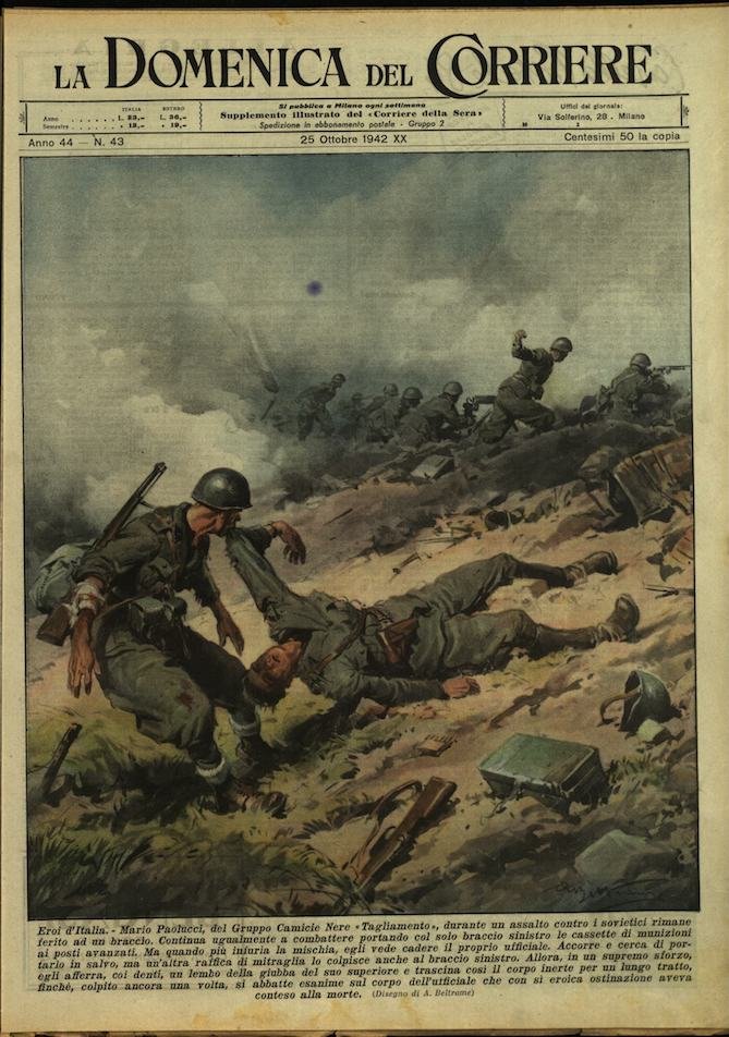 In-4, brossura, in buono stato di conservazione. In questo numero:"Eroi d'Italia. - Mario Paolucci, del Gruppo Camicie Nere Tagliamento, durante un assalto contro i sovietici rimane ferito ad un braccio. Continua ugualmente a combattere portando col solo braccio sinistro le cassette di munizioni ai posti avanzati. Ma quando più infuria la mischia, egli vede cadere il proprio ufficiale. Accorre e cerca di portarlo in salvo, ma un'altra raffica di mitraglia lo colpisce anche al braccio sinistro. Allora, in un supremo sforzo, egli afferra, coi denti, un lembo della giubba del suo superiore e trascina così il corpo inerte per un lungo tratto, finche, colpito ancora una volta, si abbatte esanime sul corpo dell'ufficiale che con si eroica ostinazione aveva conteso alla morte.""Le estreme resistenze a Stalingrad. - Snidato il nemico coi lanciafiamme, le truppe germaniche conquistano una nuova grande officina, lottando tra i rottami con gli ultimi difensori sovietici.".