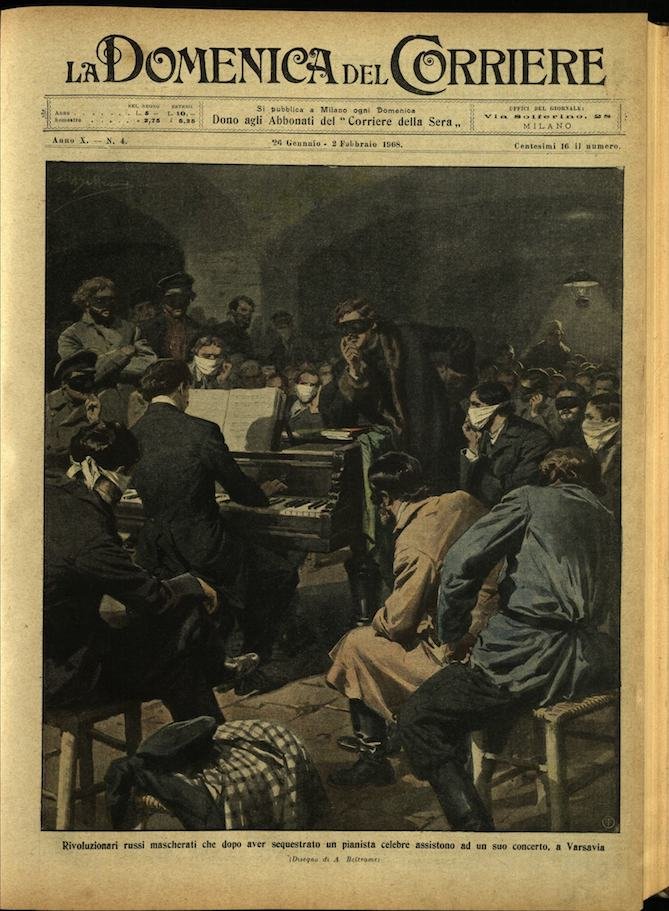 In-4, brossura, in buono stato di conservazione. In questo numero:"Rivoluzionari russi mascherati che dopo aver sequestrato un pianista celebre assistono ad un suo concerto, a Varsavia.""I drammi delle miniere, la liberazione di tre operai rimasti sepolti quarantaquattro giorni a 300 metri di profondita.".