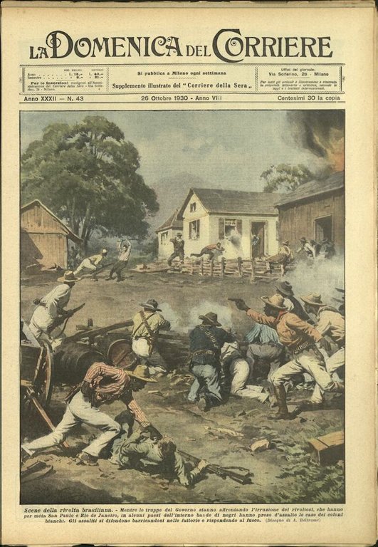 In-4, brossura, in buono stato di conservazione. In questo numero:"Scene della rivolta brasiliana. Mentre le truppe del Governo stanno affrontando l'irruzione dei rivoltosi, che hanno per meta San Paulo e Rio de Janeiro, in alcuni paesi dell'interno bande di negri hanno preso d'assalto le case dei coloni bianchi. Gli assaliti si difendono barricandosi nelle fattorie e rispondendo al fuoco.""I pavimenti che crollano. A Pontedera, in Toscana, due sacerdoti e alcuni familiari assistevano piamente una moribonda; a un tratto il pavimento della camera, per la rottura d'una trave, sprofondo, trascinando tutti nella stanza sottostante. Nel crollo l'ammalata spiro, gli altri rimasero feriti.".