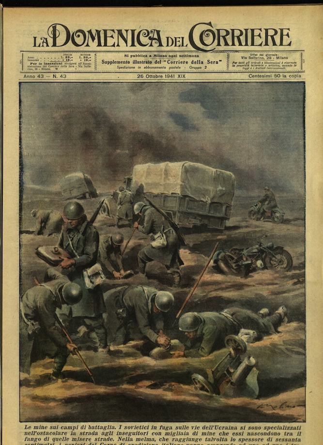 In-4, brossura, in buono stato di conservazione. In questo numero:"Le mine sui campi di battaglia. I sovietici in fuga sulle vie dell'Ucraina si sono specializzati nell'ostacolare la strada agli inseguitori con migliaia di mine che essi nascondono tra il fango di quelle misere strade. Nella melma, che raggiunge talvolta lo spessore di sessanta centimetri, i genieri del Corpo di spedizione italiano vanno scoprendo ad uno ad uno i tremendi ordigni per renderli innocui.""Il federale di Gondar esalta in una sua lettera lo spirito di sacrificio dei fedelissimi soldati coloniali che resistono tuttora nelle terre dell'Impero, da quelli che a Metemma hanno fermato con i loro petti i carri armati, a quelli delle bande di confine che hanno catturato un comandante inglese, nonché agli eroi di Uolchefit che sono andati a Gondar per continuare la lotta. E accenna specialmente ad un graduato amara, Unatu Endisciau, che, dopo essersi rifiutato di arrendersi, raggiungeva con pochi ascari animosi le retrostanti nostre linee di difesa per portare in salvo il gagliardetto del proprio reparto. Gravemente ferito, egli riusciva a consegnare in mani italiane la gloriosa insegna. Con l'approvazione del Duce è stata conferita alla sua memoria la medaglia d'oro, la prima che sia stata concessa ad un soldato coloniale.".