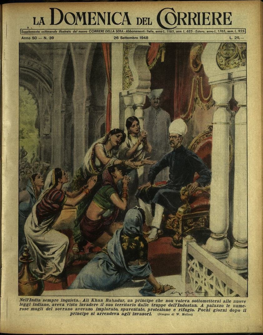 In-4, brossura, in buono stato di conservazione. In questo numero:"Un momento di terrore. Eccitato dall'abito rosso di una ragazza, un torello si getta a capo basso contro di lei.. La signorina, improvvisandosi acrobata, sfugge al pericolo arrampicandosi sul monumento a San Francesco d'Assisi. Il fatto è accaduto a Milano.""Nell'India sempre inquieta. Ali Khan Bahadur, un principe che non voleva sottomettersi alle nuove leggi indiane, aveva visto invadere il suo territorio dalle truppe dell'Indostan. A palazzo le numerose mogli del sovrano avevano implorato, spaventate, protezione e rifugio. Pochi giorni dopo il principe si arrendeva agli invasori.".