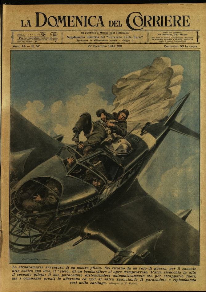In-4, brossura, in buono stato di conservazione. In questo numero:"La straordinaria avventura di un nostro pilota. Nel ritorno da un volo di guerra, per il casuale urto contro una leva, il cielo di un bombardiere si apre d'improvviso. L'aria risucchia in alto il secondo pilota; il suo paracadute distendendosi automaticamente sta per strapparlo fuori, ma i compagni pronti lo afferrano ed egli si salva sganciando il paracadute e ripiombando così nella carlinga.""Cavalieri contro aviatori. - Sul fronte orientale, un bombardiere sovietico, colpito dall'artiglieria, precipita al suolo, una pattuglia di cavalleria romena accorre per catturare i superstiti, ma questi aprono il fuoco. Si svolge allora attorno all'apparecchio un audace carosello che, stringendosi sempre piu, chiude in un cerchio il nemico e lo fa prigioniero.".