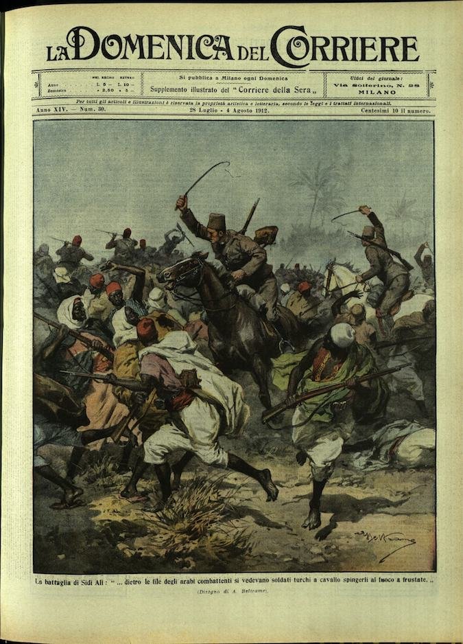 In-4, brossura, in buono stato di conservazione. In questo numero:"Audace incursione notturna delle nostre torpediniere dentro lo stretto dei Dardanelli fra il fuoco nemico.""La battaglia di Sidi Ali, ..dietro le file degli arabi combattenti si vedevano soldati turchi a cavallo spingerli al fuoco a frustate.".